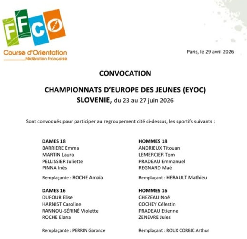 Bravo à Tom qui, après sa 1ère sélection pour les EYOC (European Youth Orienteering Championship) en 2025,  est de nouveau sélectionné en 2026. Il  participera aux prochains EYOC qui auront lieu du 23 au 27 juin 2026 en Slovénie! 💪💪💪🎉🎉🎉🥳🥳🥳🤩🤩🤩
